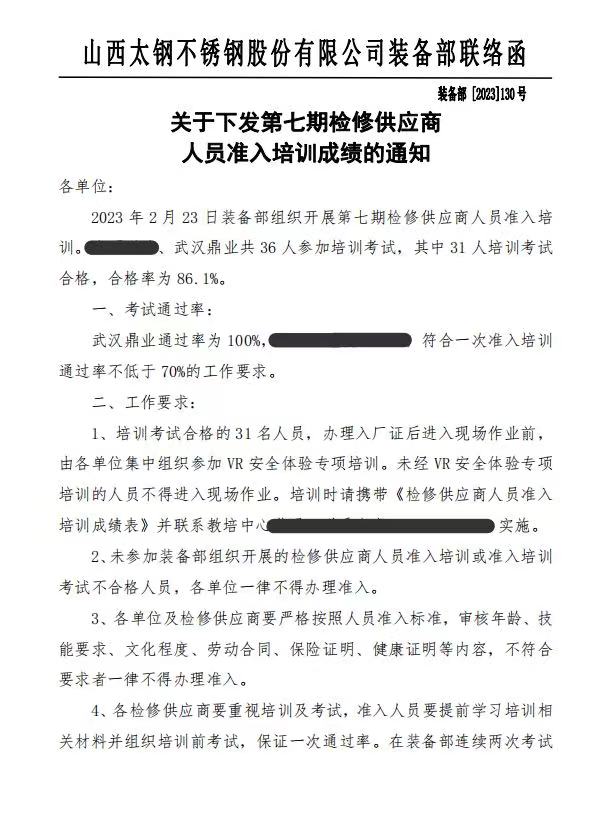 2023年2月23日裝備部組織開展第七期檢修供應商人員準入培訓。武漢鼎業與其他單位共36人參加培訓考試,其中31人培訓考試合格,合格率為86.1%。
